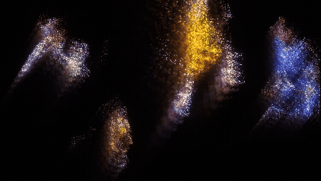 Feed that into GPU particles; each frame, particles are emitted from the current silhouette, then processed with feedback, blur, and bloom to get a dense glowing volume.